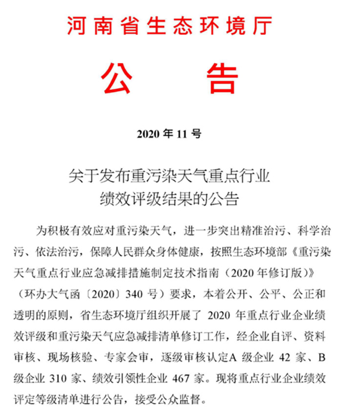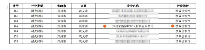 10月26日,在河南省生態(tài)環(huán)境廳印發(fā)了《關(guān)于發(fā)布重污染天氣重點(diǎn)行業(yè)績效評級結(jié)果的公告》(〔2020〕年11號)中,鄭州榮盛窯爐耐火材料有限公司獲評“績效引領(lǐng)性企業(yè)”,這是繼公司榮獲“高新技術(shù)企業(yè)”、省級“科技型中小企業(yè)”后,再添喜訊。